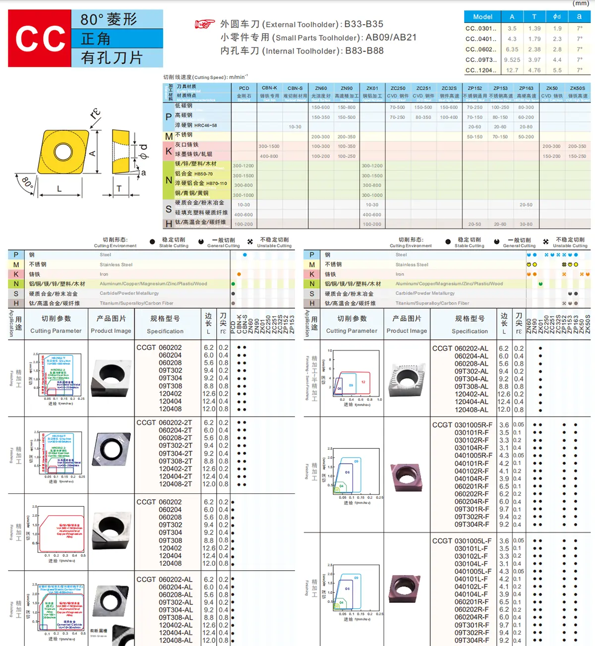 80°菱形,正角,有孔刀片。外圆车刀:B33-B35;小零件专用:AB09/AB21;内孔车刀:B83-B88。