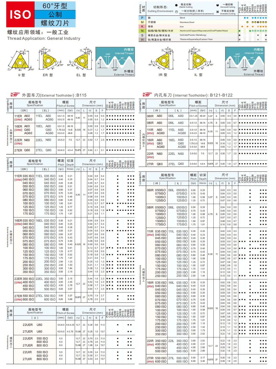 60°牙型,公制,螺纹刀片,螺纹应用领域:一般工业