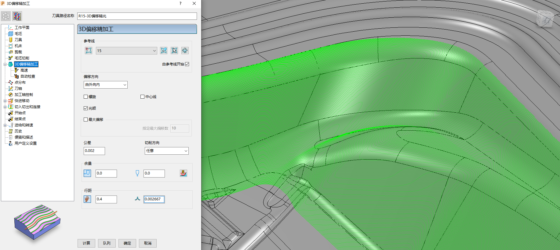 D30 ball knife finishing step for the inner plate (0.5mm) outer plate (0.4mm), programmed to calculate the tolerance for the inner plate (0.005), the outer plate (0.003 or less), the outer plate molds and Cr12MoV material requires two finishing (the last knife finishing volume of processing 0.05-0.1mm)